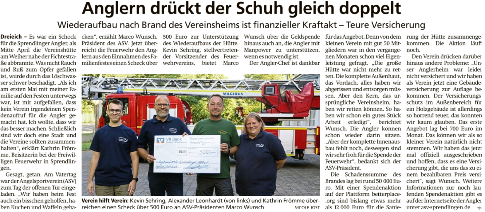 Am Samstag, 12. April 2025, brannte gegen 14 Uhr das Vereinsheim des 1. Angelsportvereins Sprendlingen am Weiher nahe der Fichtestraße ab. Verletzt wurde niemand. Nach Angaben der Polizei habe sich während des Vorfalls niemand auf dem Gelände befunden. Gleichwohl kämpften mehrere Feuerwehren aus Dreieich und Neu-Isenburg bei starker Rauchentwicklung erfolgreich gegen die Flammen. Zudem kamen eine Drohne und eine Wärmebildkamera zum Einsatz, um Glutnester ausfindig zu machen. Insgesamt waren 50 Einsatzkräfte vor Ort, darunter auch Polizisten und Mitarbeiter des Roten Kreuzes. Die Brandursache ist noch unklar. Zunächst fing eine Hecke Feuer. Kurze Zeit später griffen die Flammen auf das Vereinsheim über. Der Schaden beträgt rund 50000 Euro.